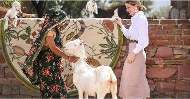 The final stage of the walk takes us to the large draped tents that were once set up for country lunches. The rug’s design is inspired by an English marquee. Creating a festive spirit of fun and celebrations as witnessed on the lawns of English estates, the rug is perfect for celebratory spaces. In addition, the rug’s vibrant hues and distinct design make it more than just a floor covering, allowing its versatility to expand to being wall tapestry or ceiling decor.